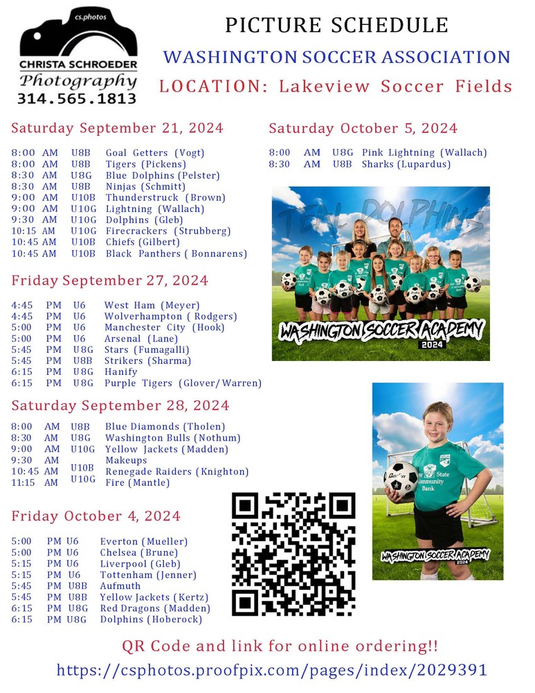 Please arrive at WSA fields with your player 10 minutes before their scheduled photo time dressed in their team jersey, shorts, shin guards, socks and cleats.